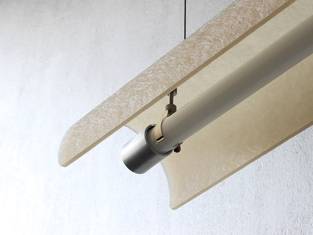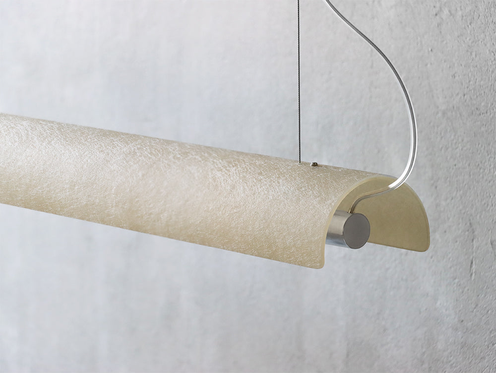 繊維と樹脂を積層し、強化され硬質ですが、繊維の表情やフォルムで柔らかい印象とし、相反する要素をひとつのプロダクトといたしました。